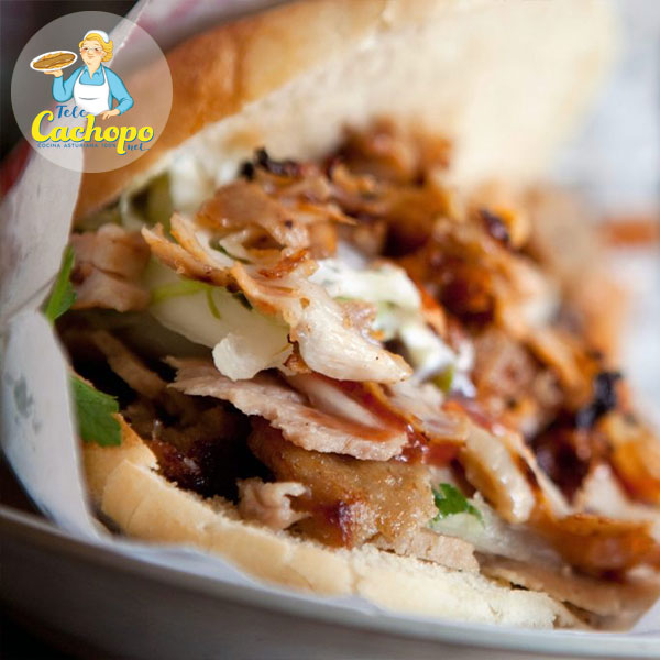 Carne de Corderu Xaldu, lechuga, tomate, cebolla y salsas.